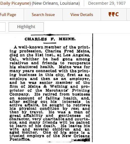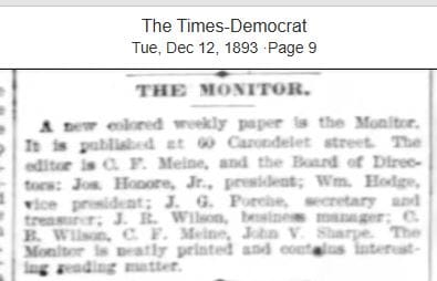 - May 19: My Maw Maw visits me in a dream that morning. I know it was a visit, because I knew in the dream that she was dead, and I saw the light and felt the warmth coming from her. I finish my Mary, Undoer of Knots novena. I literally hear something in my ear say “New Orleans East newspaper.” I look up my great-great grandfather, Charles Frederick Meine, who I’ve looked up many times before, and see that he made a weekly newspaper! It was called The Monitor.
